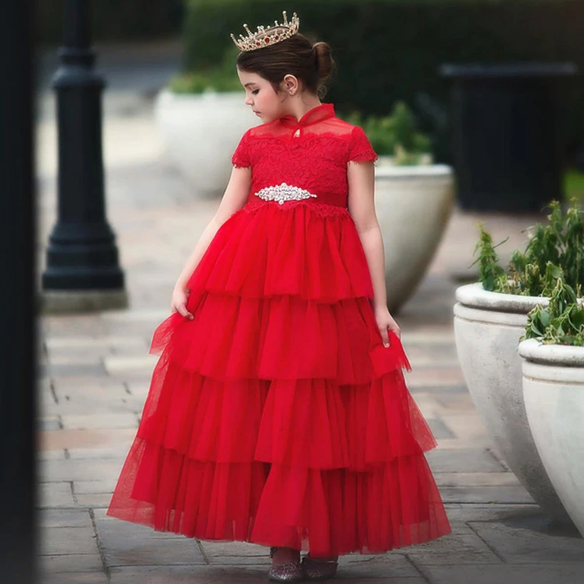 This dress is amazing. It has ruffles, it has lace, it has sparkle and drama! The french lace bodice covers a sweetheart neckline with our signature soft fabrications, never scratchy. The skirt is comprised of layer and layers of bouncy, twirly tulling that extend down to the ground. The removable sparkle belt self ties in back for just the right fit. This is a showstopper gown and will be a favorite for generations to come. 100% poly self, 100% soft cotton lining. Machine wash, hang dry. Fully lined, back zip.