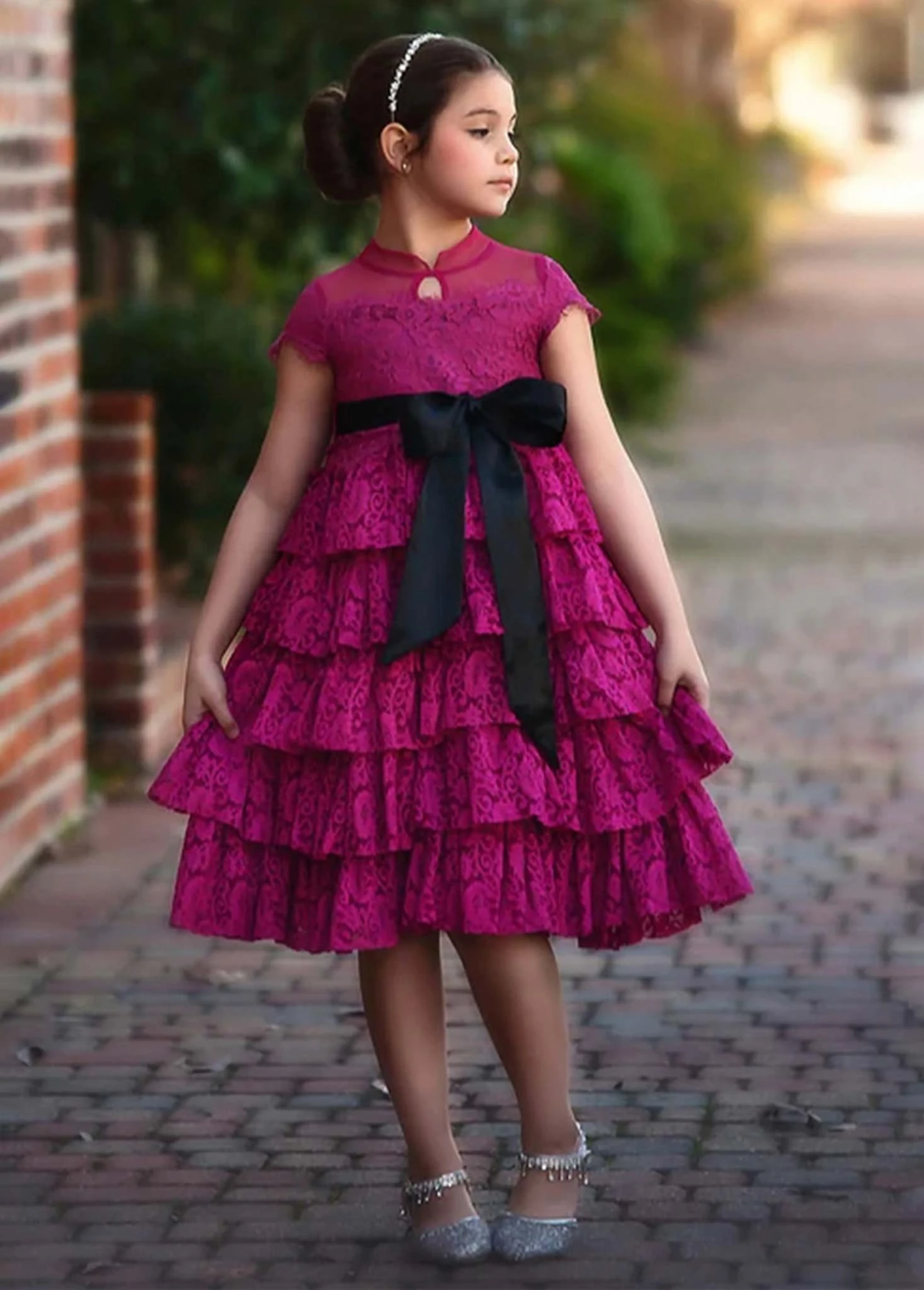 One of our most stunning gowns to date, this ruffled masterpiece will not disappoint! Our signature soft, French inspired lace, is perfectly layered and finished off with a removable black sash. Pair this with our fabulous black fan and gold Gramercy boots for the perfect head turning outfit. This gown is fully lined with soft cotton and back zips. Machine wash, hang dry.