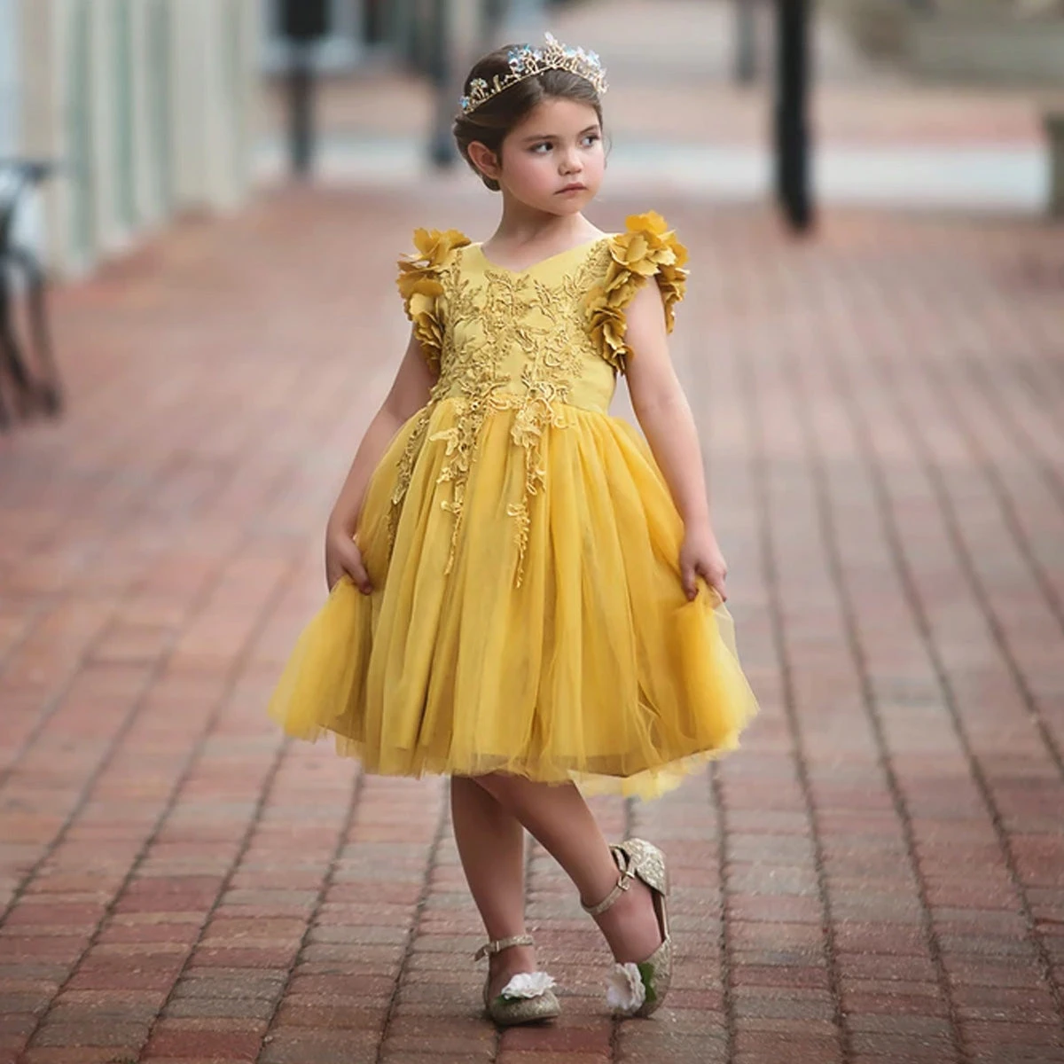 Fit for a princess, this dress has it all. Soft mustard satin graced with a touch of lace, this dress is a showstopper! Sleeves are embellished with whimsical die cut flowers that will have all eyes on her. Tuling overlay skirt adds just the right touch of fullness and twirl. Fully lined with soft cotton, back zip. 100% poly self, 100% cotton lining. Machine wash, hang dry.