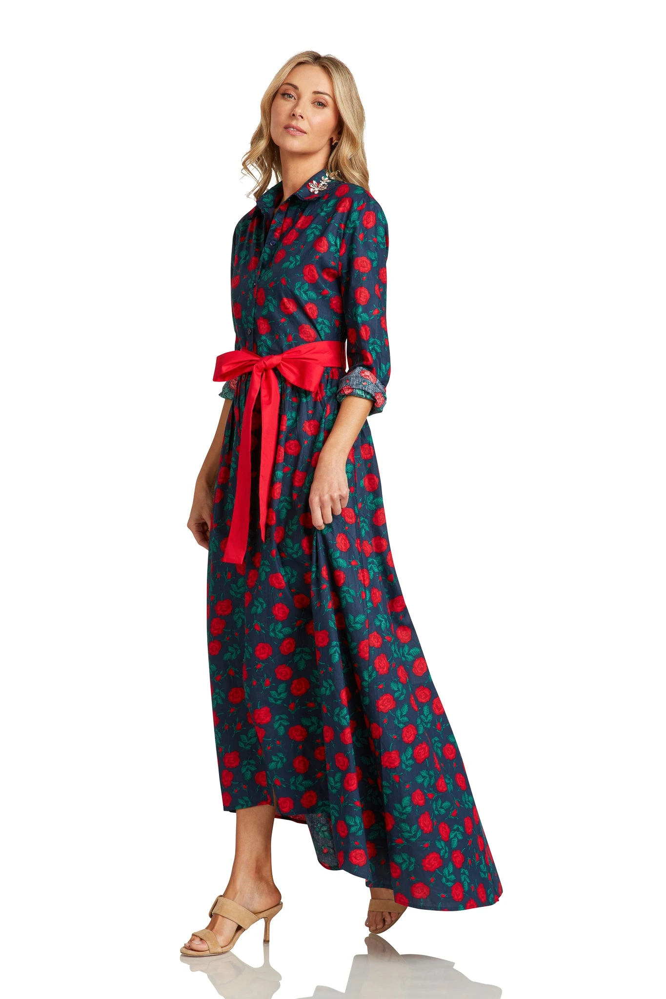 This stunning maxi is the ultimate head-turner. Our take on a classic shirt dress, this button-front maxi boasts a subtle hi-low skirt for an extra dramatic effect, a jeweled collar for that extra hint of sparkle and a removable waist tie for that perfect fit. This dress is truly a showstopper!