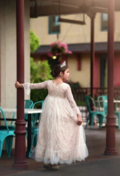 THIS DRESS RUNS ONE SIZE SMALL, WE ADVISE ORDERING UP ONE SIZE This stunning vintage lace gown will have all eyes on her! Our signature French inspired lace with eyelash trim is layered with tuling to create an oh so girly twirly frock! This gown is fully lined with soft cotton and our signature soft lace and fabrications are perfect for the most tactile sensitive child. She will never stop twirling! 100% poly self, 100% soft cotton lining. Machine wash, hang dry.