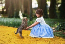 She will be as cute as can be in this darling frock! The gingham skirt is super full for lots of twirl. The white cotton embroidery sleeves are full of poof and whimsy. The bodice is finished off with a luxe floral trim adding just the right touch of sweet. Follow the yellow brick road and have fun dreaming up her magical photo shoot with this dress! You will be so thrilled with the quality, it’s an amazing dress and hardly a cheap costume. Definitely one to be passed down for years to come. 100% cotton, fully lined, back zip. Machine wash, hang dry. DON’T FORGET HER MATCHING DOLL DRESS!