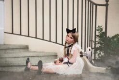 Inspired by Trish’s travels to France, this dress has all the glam and retro vibes! Etheareal dot lace meets overlays a butterscotch lining for an extra rich look. This dress is finished off with stunning velvet ribbon and a cape collar!
