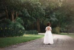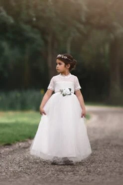 This vintage inspired lace frock is absolutely stunning in person. The color is a dreamy white and photographs amazing. The lace is soft, not scratchy and has a French eyelash edging, creating a perfect touch of vintage whimsy. The back boasts a darling heart shape opening that shows off her sweet little back. The dress is fully lined with soft cotton and has a back zipper. The floral braided rope belt is completely removable and self ties in back for just the right touch of sweetness. 100% poly self, 100% soft cotton lining. Machine wash, hang dry.