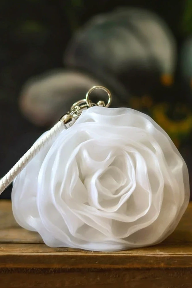 Beautiful layers of soft polyester are sewn to create an elegant rose design, and finished off with a rope chain.