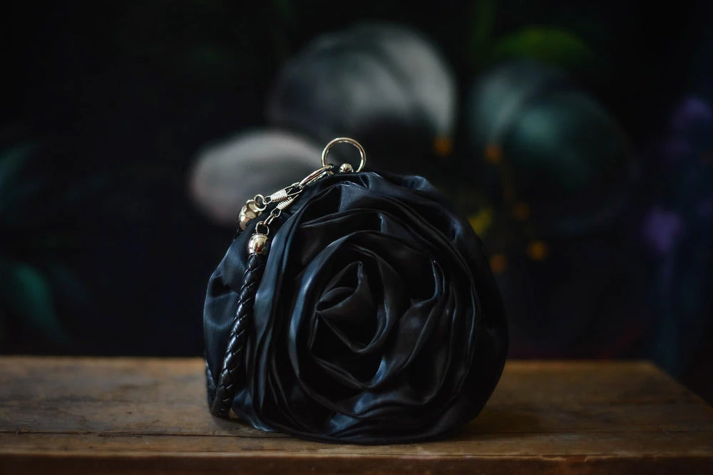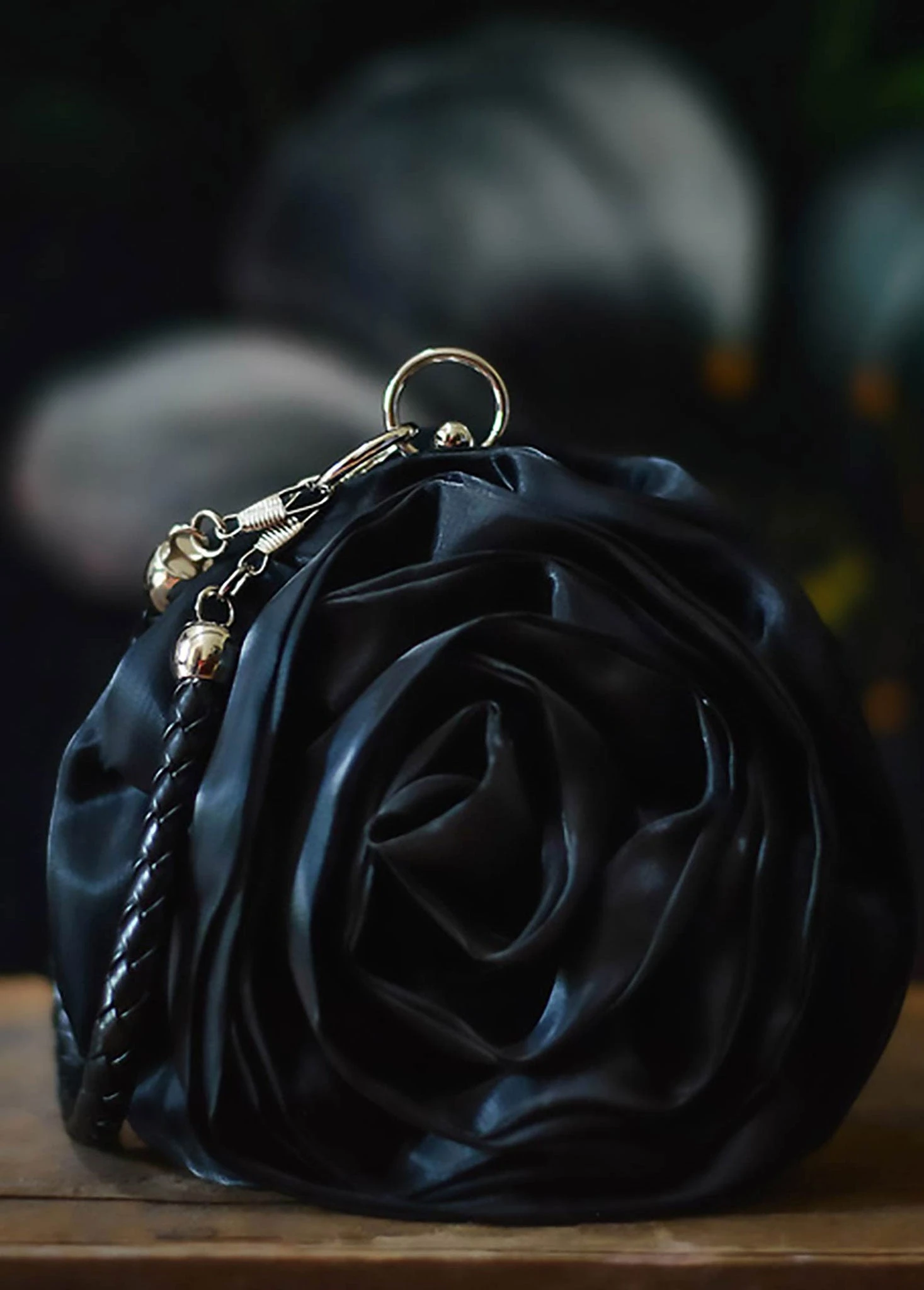 Beautiful layers of soft polyester are sewn to create an elegant rose design, and finished off with a rope chain.