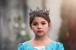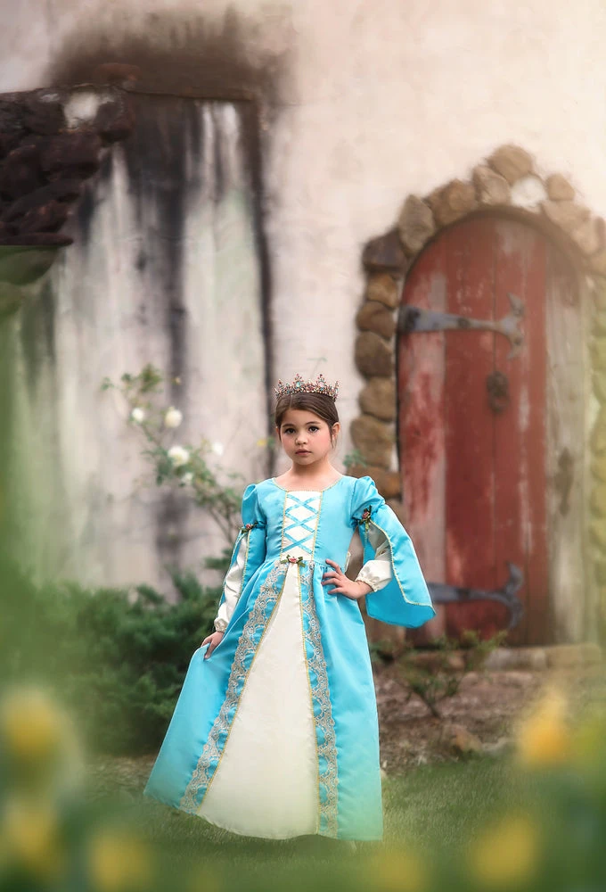 One of our most royal dresses to date, she will have so much fun wearing this one! Not a detail left untouched, the soft blue satin is graced with gold trimmings and flower detailing. The sleeves are pure royalty full of pomp and circumstance. This gorgeous gown self ties in back, for just the right fit! Fully lined with soft cotton, never itchy and like all of our products, NO glitter EVER!
