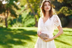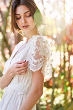 A must have in your Spring wardrobe! A delicate dot fabric meets sweet embroidery and trims, subtle ruffles, and finished with a cap sleeve adorned with gorgeous lace. A feminine v-neck is finished with delicate buttons. A perfect choice for beach, dinner, party or photoshoot. Gorgeous coming and going!