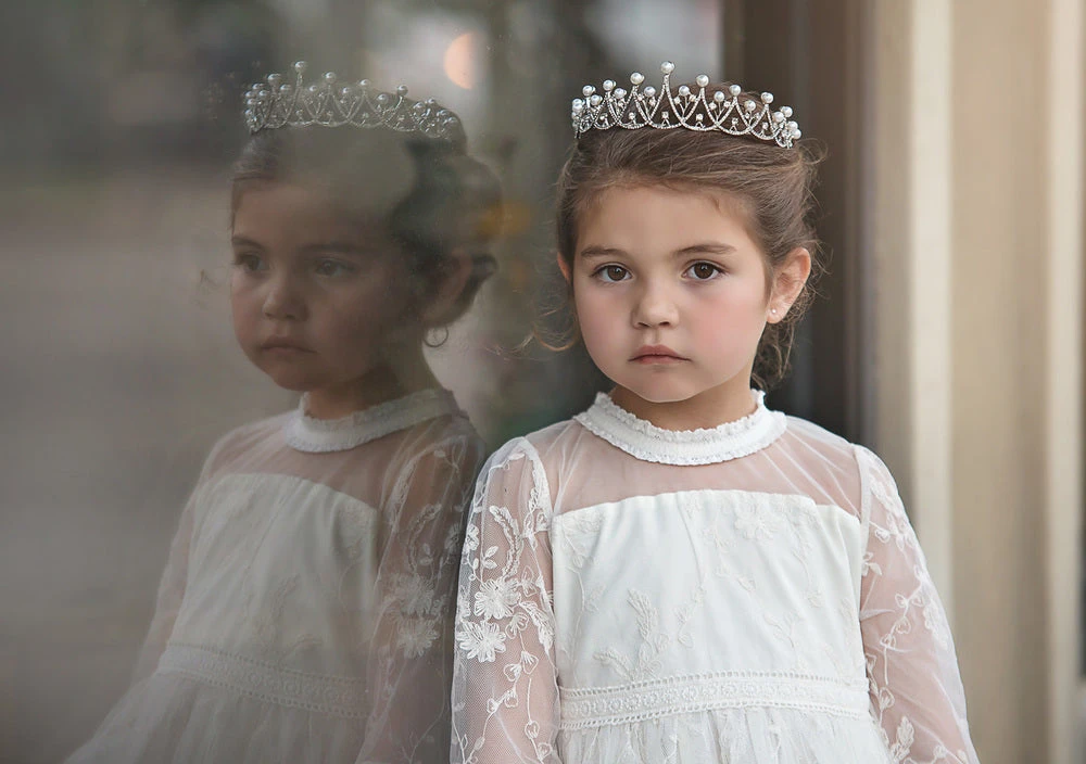 This tiara is a showstopper! A beautiful blend of pearls and rhinestones, in a metal setting, this tiara will not disappoint. While we show these on our child models, we have brides that love our tiaras, because they are THAT nice. Definitely a photographers dream to shoot.