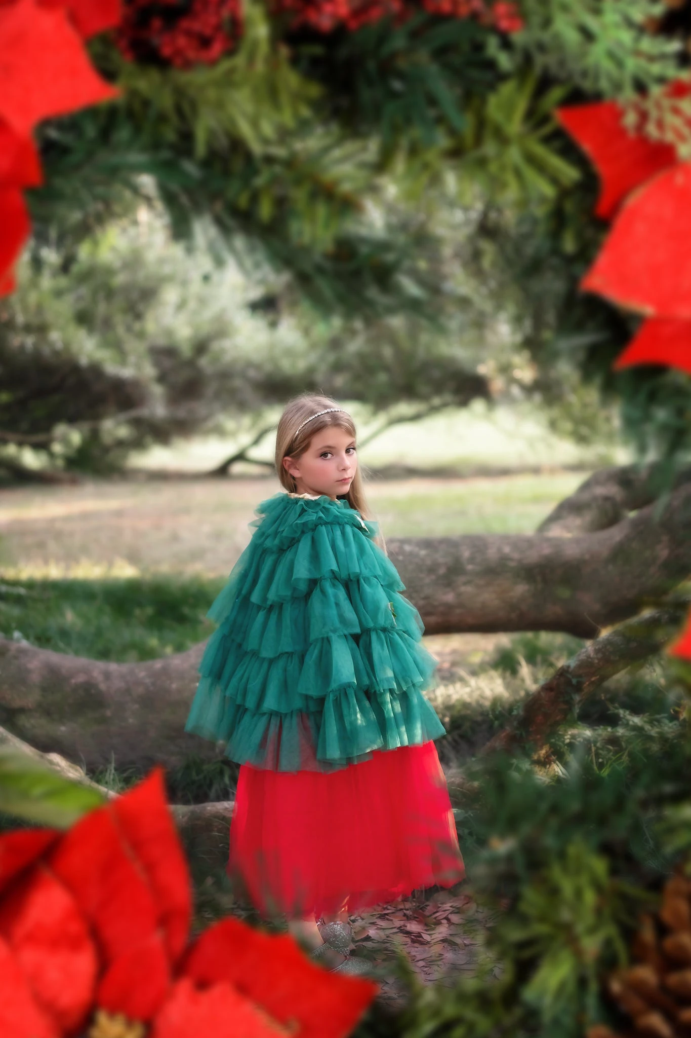 The most darling cape to complete her holiday look! Layers upon layers of ruffled tulle grace this cape, adorned with 8 removable pins for her to customize her look. Pairs wonderfully with any of our gowns for an extra special, formal look, and doubles as a whimsical dress-up piece to be worn at home!